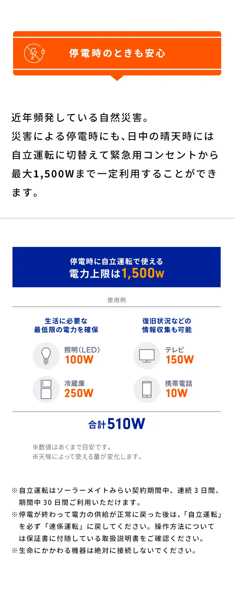 災害による停電時にも、日中の晴天時には自立運転に切替えて緊急用コンセントから
